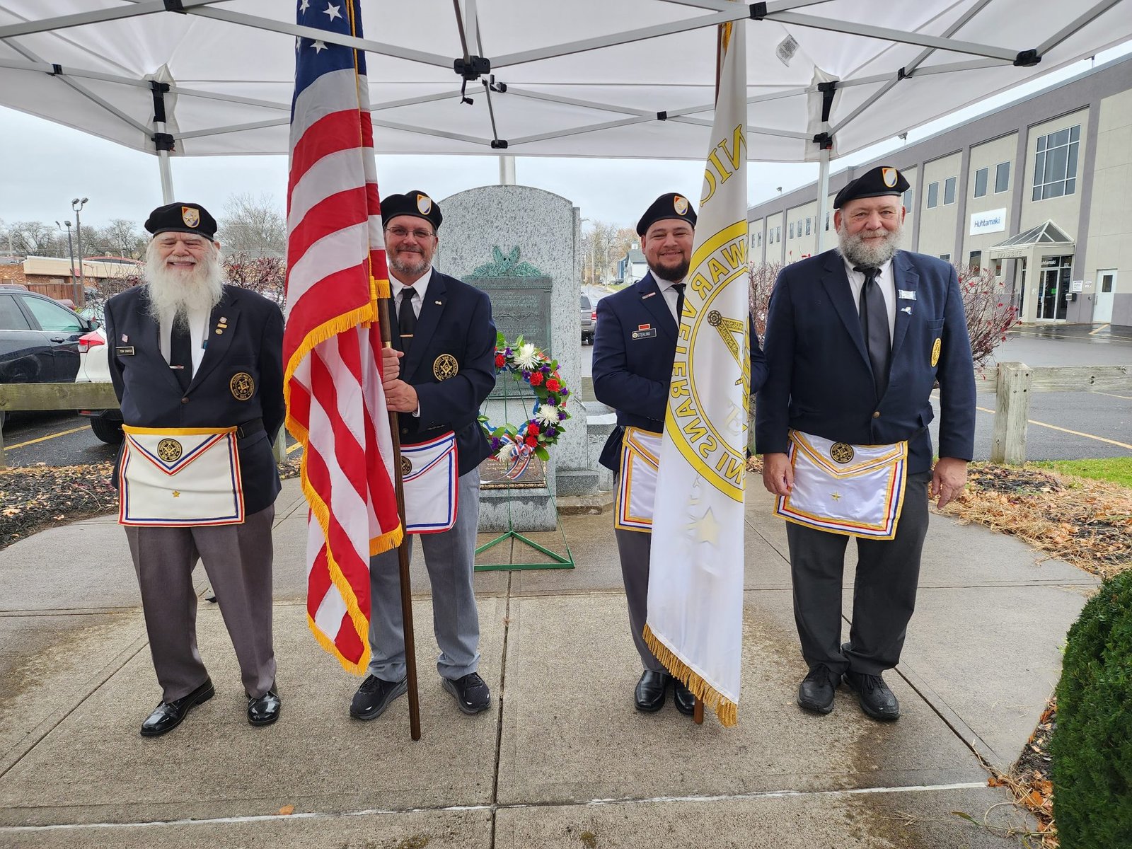 The members of MWV Onondaga Post 66 were asked to provide a color guard for a Veteran’s Day celebration at Huhtamaki in Fulton, NY. The ceremony kicked off at 12:30pm and was well attended by Veterans of the company as well as some local Veterans and representatives from Veteran organizations. The color guard consisted of R∴W∴ Thomas Sawyer – Grand Post Chaplain General Emeritus, R∴W∴ John Pierce – MWV Onondaga Post 66 Adjutant, W∴ Ken Sterling – MWV Onondaga Post 66 Commander and Grand Post Adjutant General, and R∴W∴ Garry Visconti – MWV Onondaga Post 66 Grand Post Representative and Grand Post State Director General.